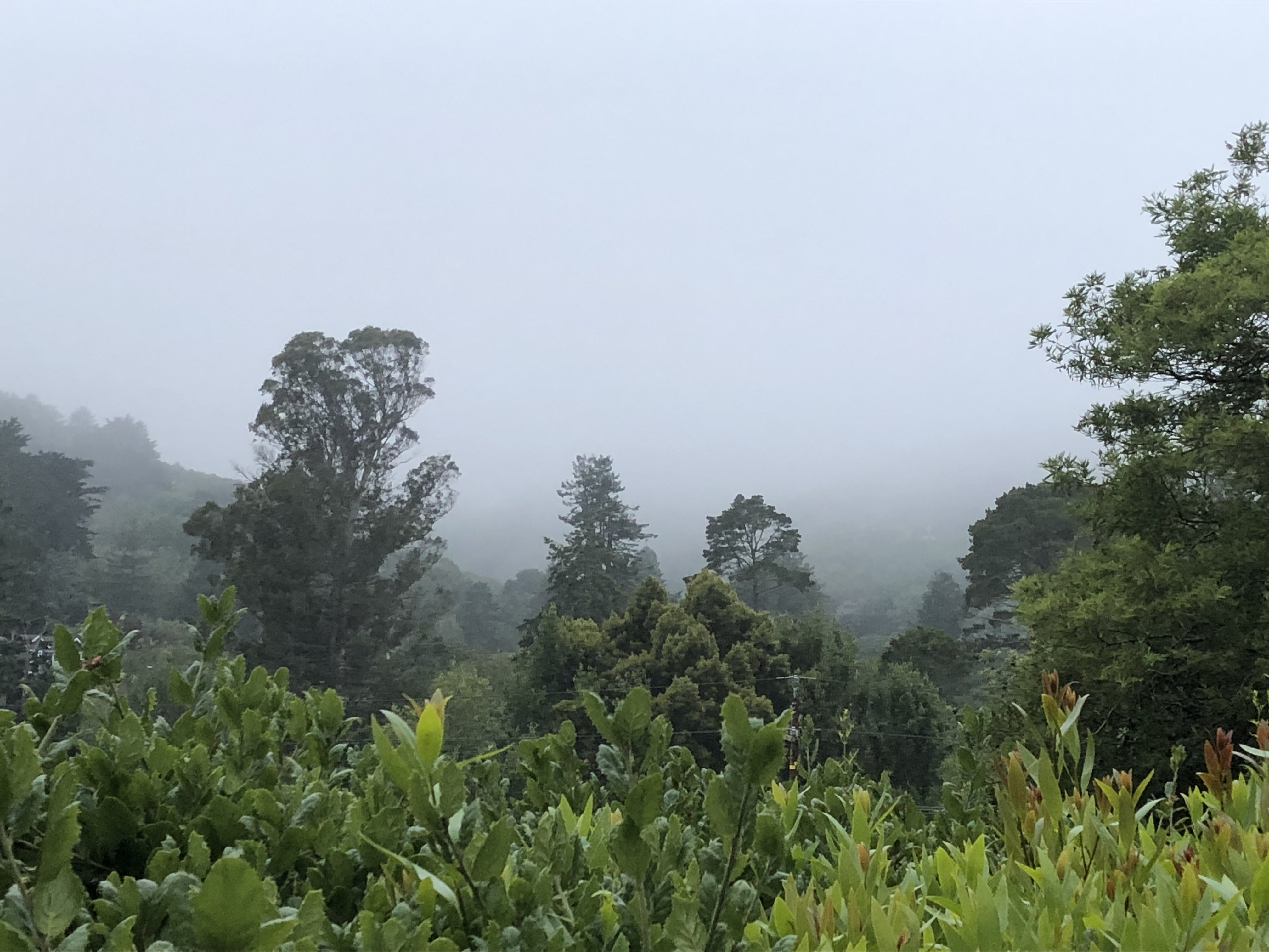 An owl calls who, who, who, and insides reply, “all here”, and outside fog holds a veil of mist, and ridge and ocean, though unseen, are here. Gratitude completes.