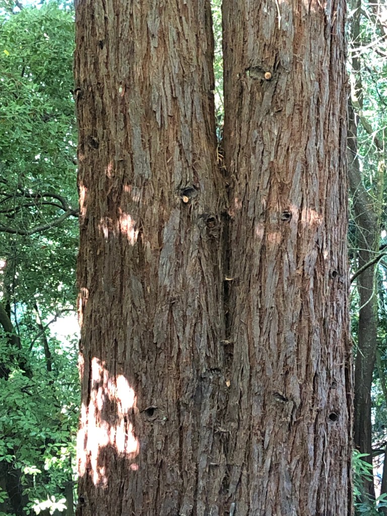 I sit on a bench down below in our yard, commune with a giant redwood tree. I feel its gratitude for the hose of running water I’ve placed at her feet. We appreciate the hum.
