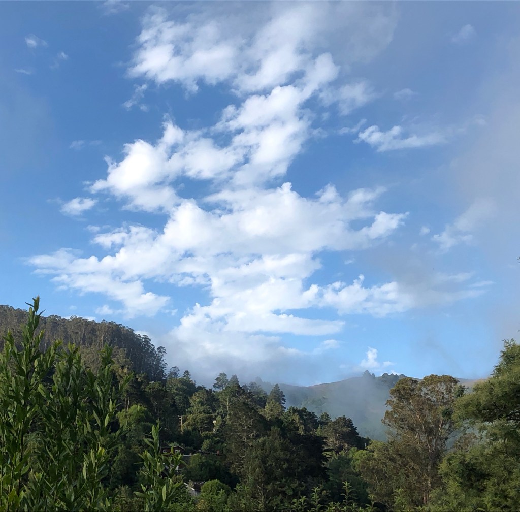 The sky this morning is a dance of clouds, formations changing with wisps of fog threading through. Perhaps it’s how the flower feels when a hummingbird dips its beak in to sip, though maybe I’m the hummingbird sipping nectar from sky and trees.
