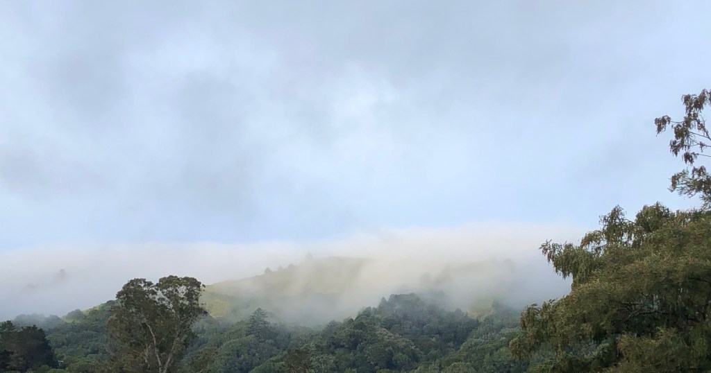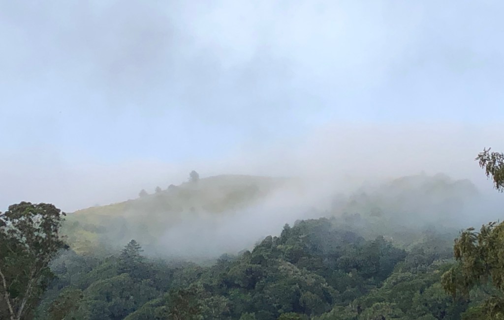 In 19th century novels, the weather often sets the mood, the tone, for the scene. Perhaps that’s still true in books as it anchors our response to our natural surroundings. Sometimes where I live the fog comes roaring in, but not today. Today I rise and feel a difference in the air, a resting place, support. I walk out to see and feel soft fog resting on the ridge.