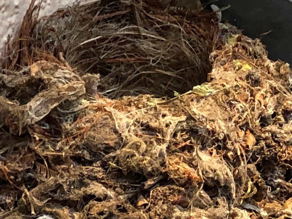 This morning my husband and I were sitting outside as the day came to light, and we spied a little nest constructed on top of our power meter.  I stood up on a bench to take pictures.  The nest is empty now but clearly for the makers it was an amazing achievement, and a brilliant choice of location as it’s high up and next to a motion detector light.
