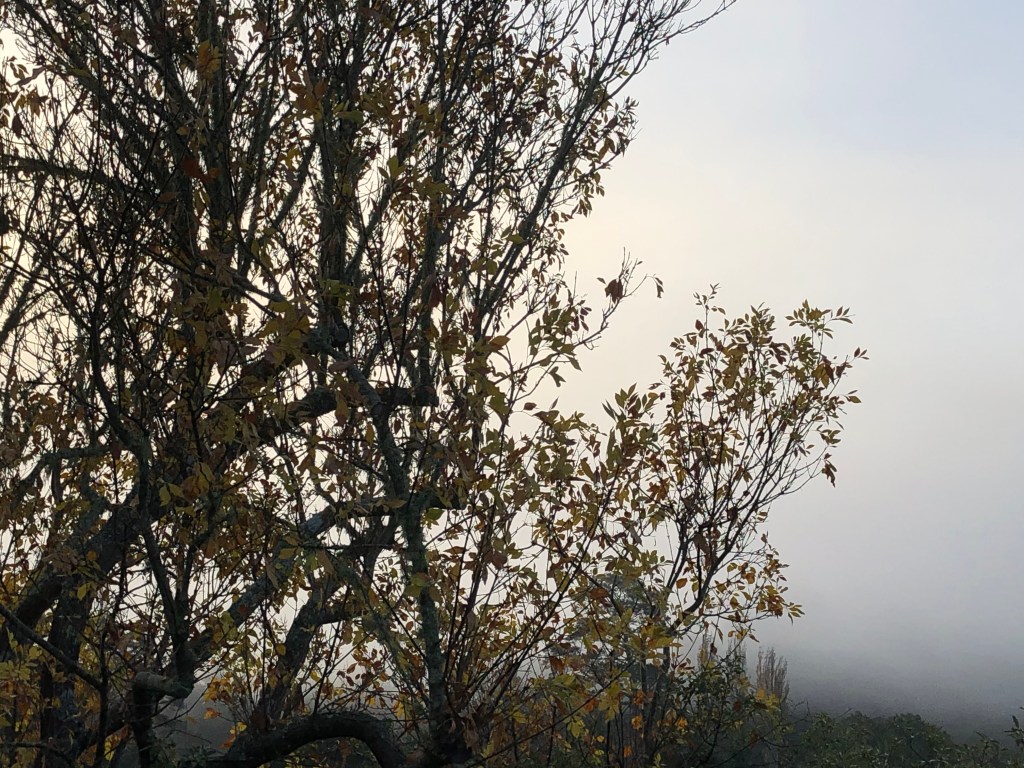 The fog floated in softly this morning. Yesterday I heard leaves falling. Today the tree is mainly bare, open to the light.