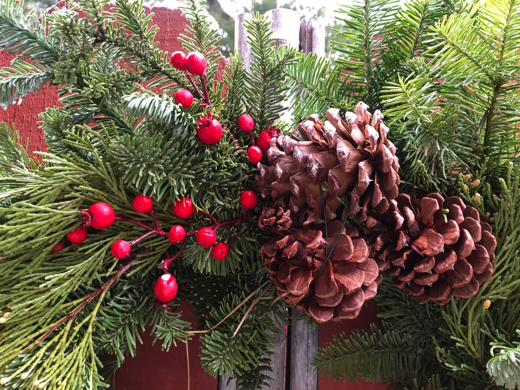 I’ve changed the colors in my home from autumn gold and orange to red and green. Inside reflects outside as the branches on the trees are bare but berries shine red and share space with pine cones on green wreaths.