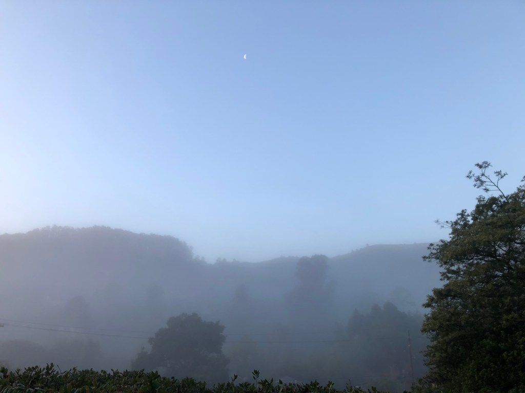 The fog is in and outside my home I see the redwood tree and the oak but other than that, I’m gently tucked. I hear the fog horn and the cackling caws of crows.