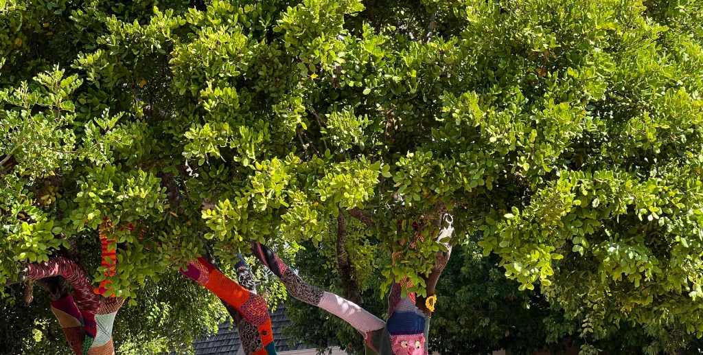 Trunks of trees wrapped in yarn
