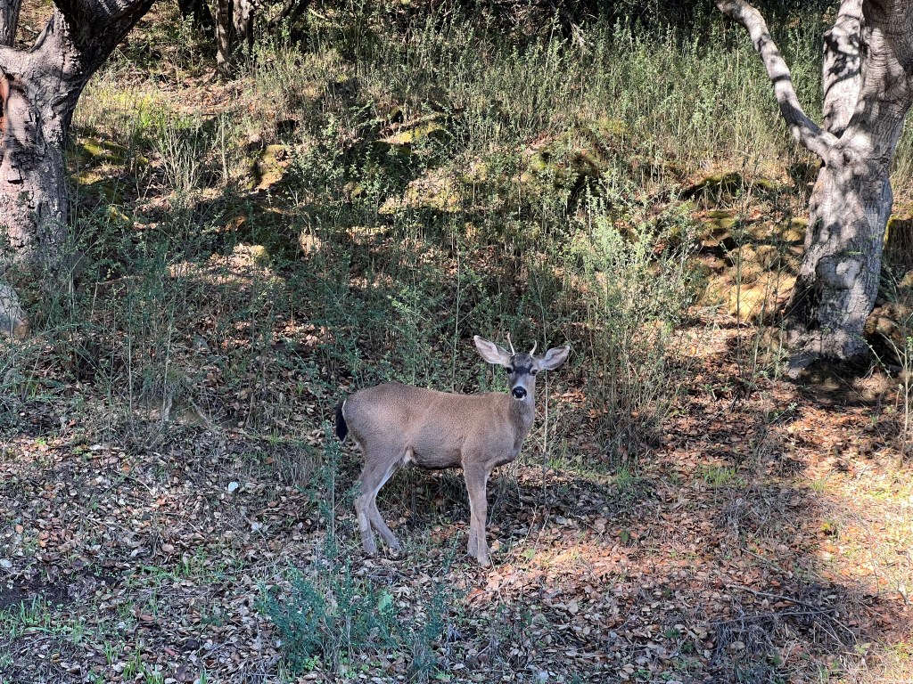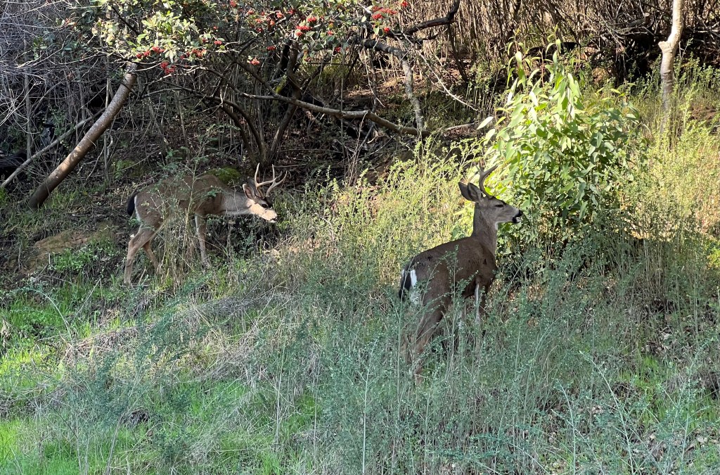 While waiting in a parking lot for a friend to drive me to the Sausalito ferry for a gathering in the city, I heard a noise behind me. There was a young buck with tiny antlers. We hung out together while he nibbled, and then a second appeared with bigger antlers, and then a third with even more branching.