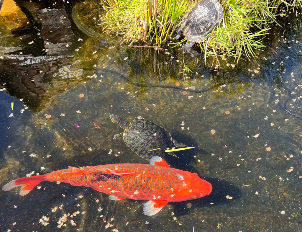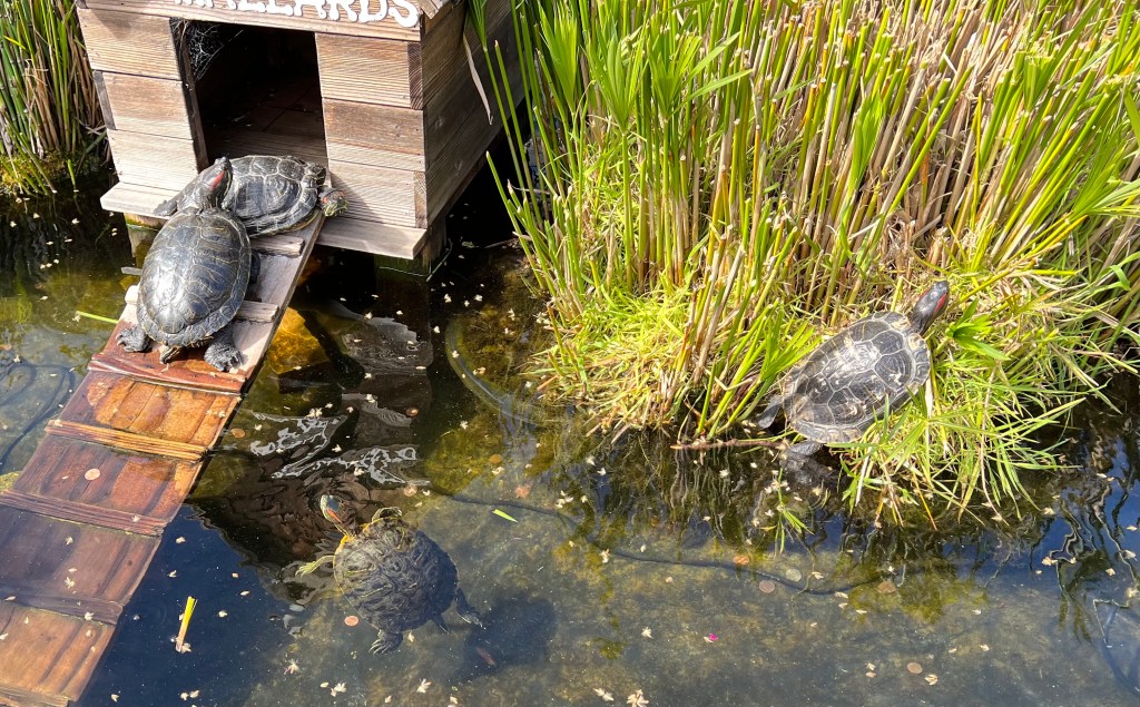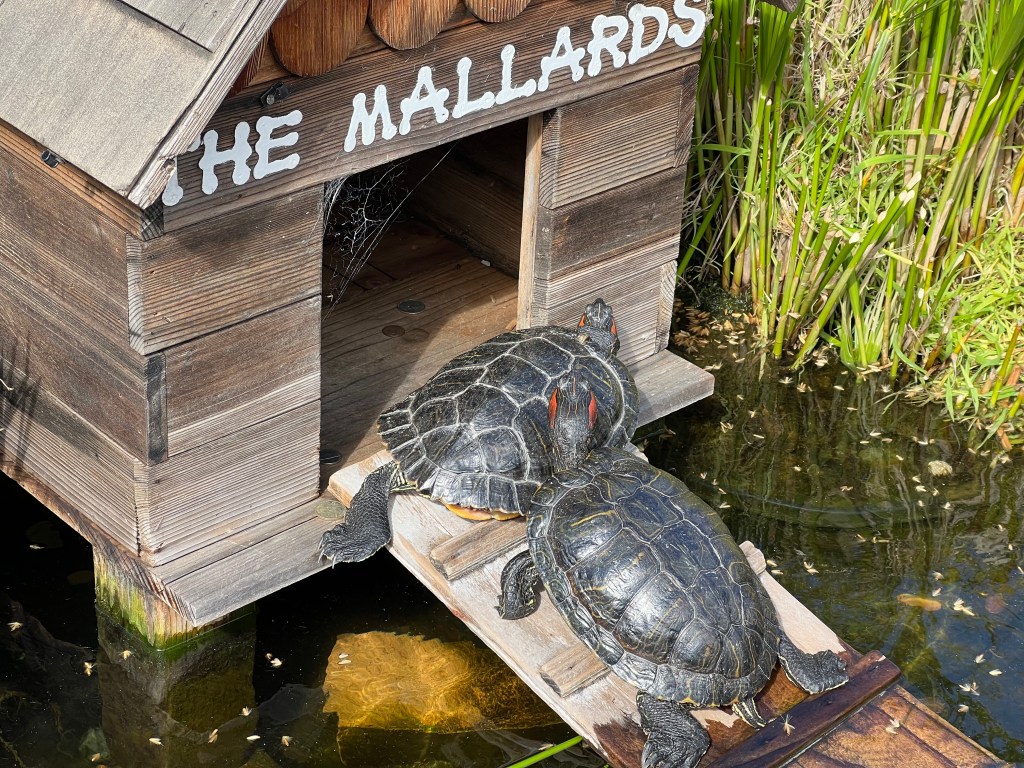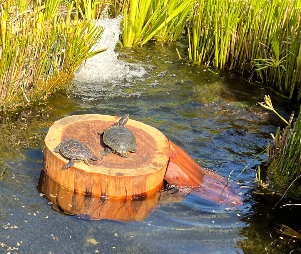 Yesterday I was at Larkspur Landing and coming up to the fountain saw two turtles. They weren’t moving and didn’t look real so I thought they were decoratively placed to allow the mallards to step over to enter their abode. Then, they moved, not much, just a blink and a shot of tongue. Yes, the turtles are real, and judging from the cobweb the mallards aren’t impressed with their house.