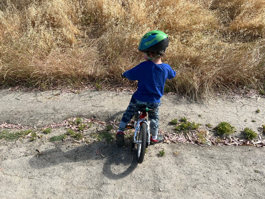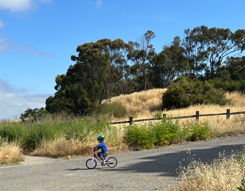 Yesterday I was at Bedwell Bayfront Park with my three and a half year old grandson and his dad. I was watching him ride his new bicycle, a bike complete with hand brakes and a kickstand.