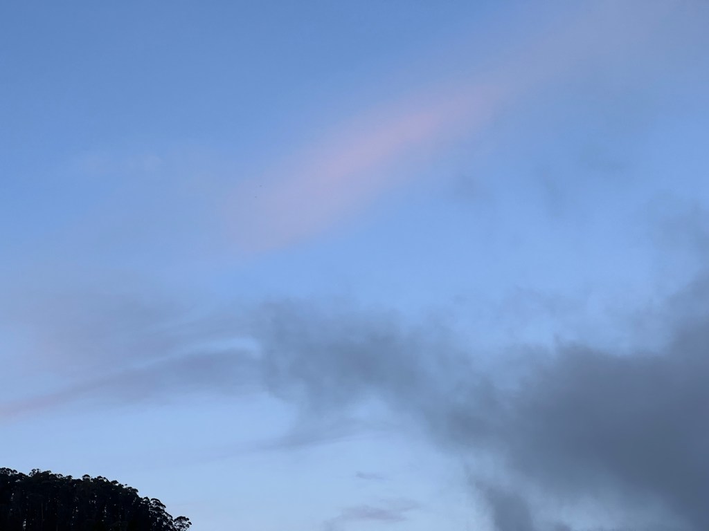 This morning the sky was a mix of clarity, fog, and a vibrant pink streak. Now all is blue with some white streaks of clouds. Touch possibility and guidance in change.