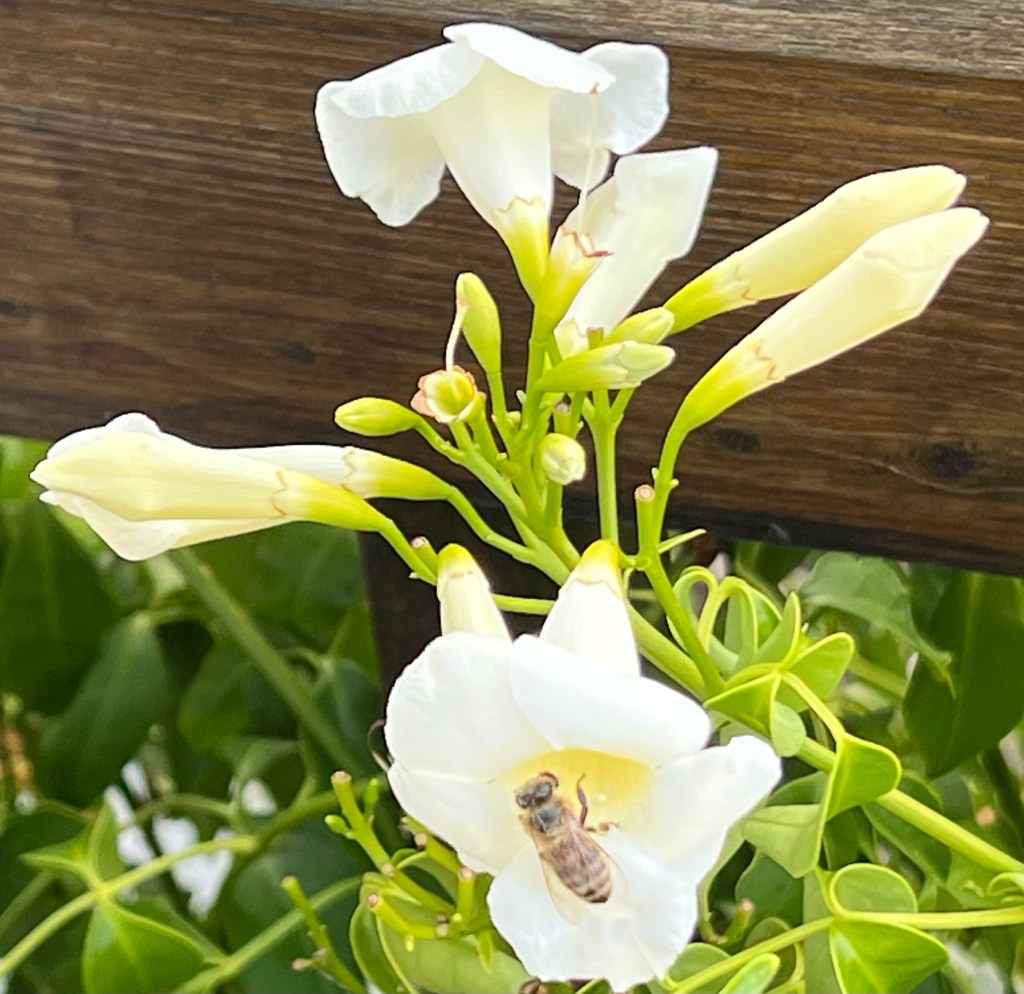 Yesterday I was taking pictures in our yard when I was surprised to see a bee come out of a jasmine flower.