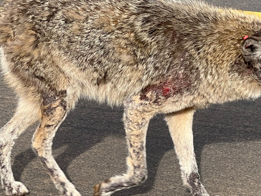 On Thursday at Rodeo Beach, a coyote passed by me. I took pictures but it wasn’t until I looked at them at home that I realized the coyote was injured.