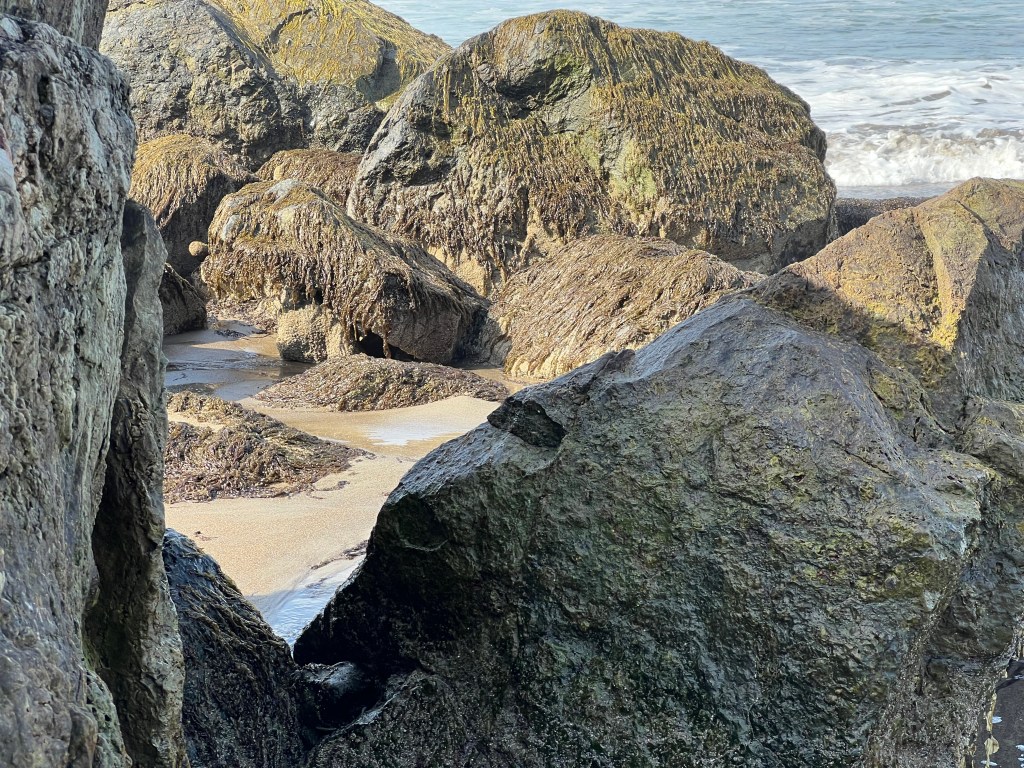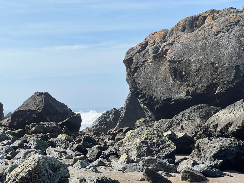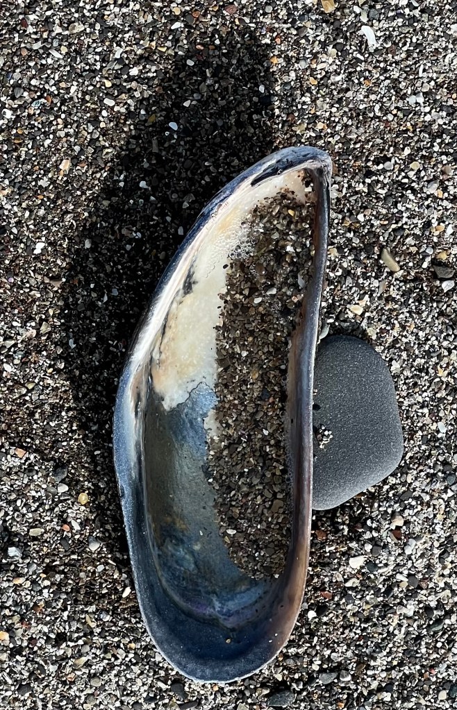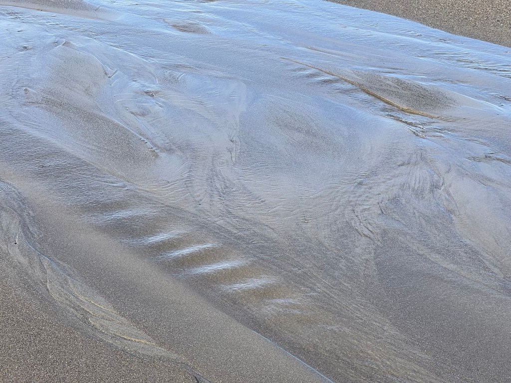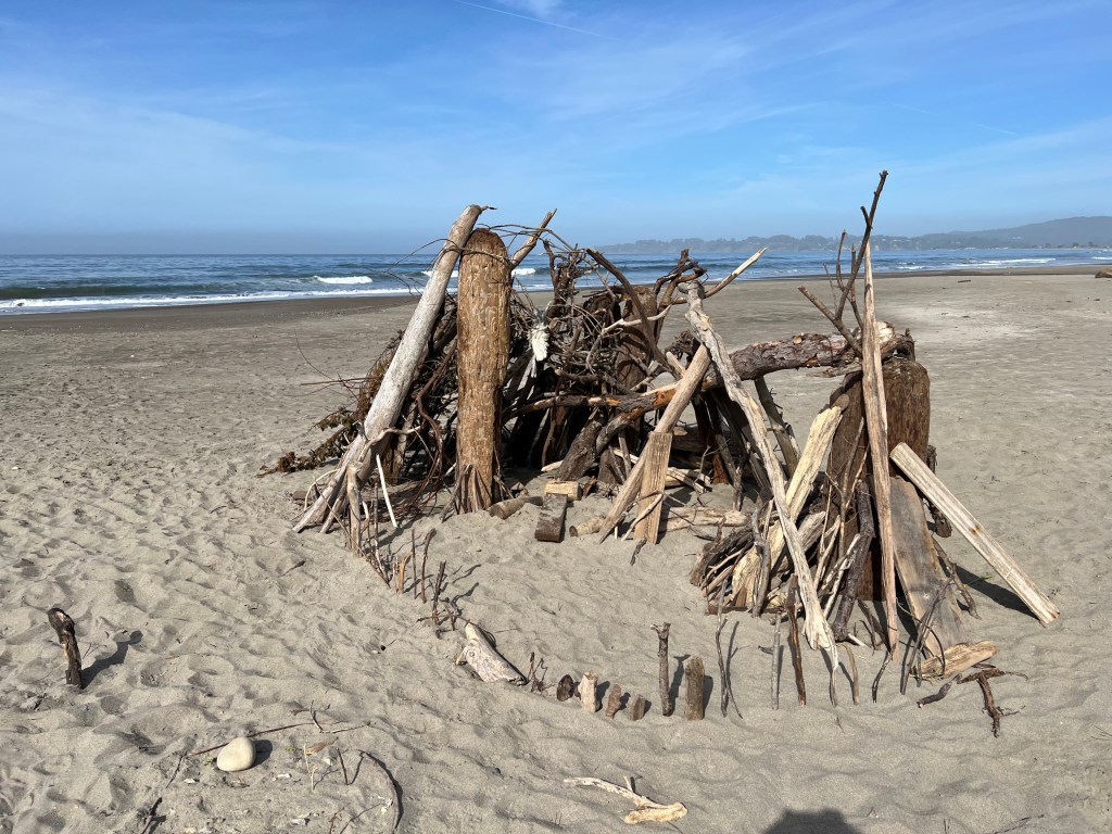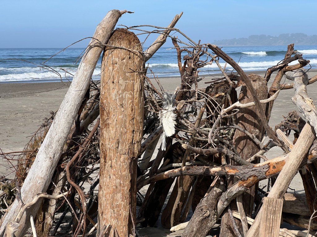 I drove to Stinson Beach this morning. I was early enough to be alone on the beach at low tide. When I lay back on the sand, I heard the waves from underneath and all around, pounding jets, surround sound. Sandpipers skittered and one turkey vulture enjoyed a breakfast of decaying seagull.