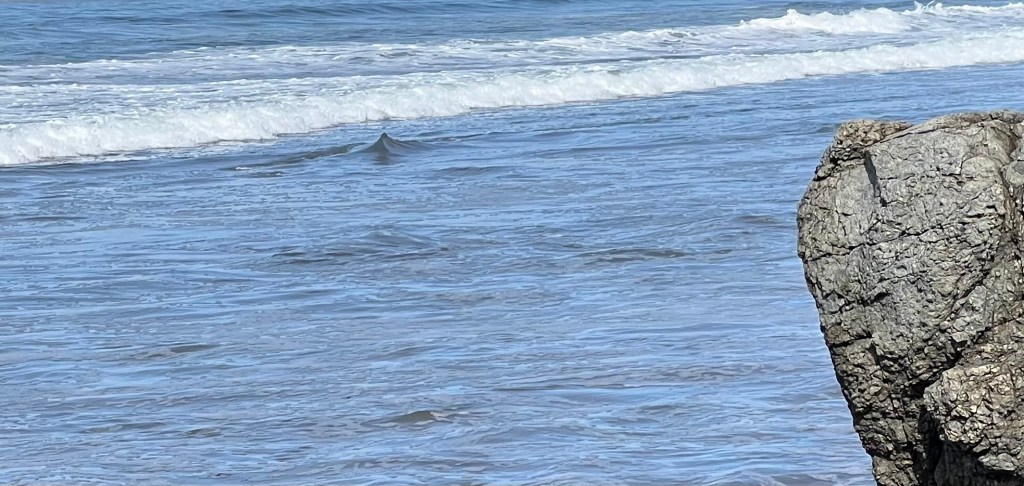 love your photos and comments. We were in Cambria last week. While sitting watching the waves I saw a fin break behind the pod of surfers. I said dolphin, my husband said shark. Because the first fin was joined by others in a rolling line moving down the coast, I think dolphins. Yours – shark!