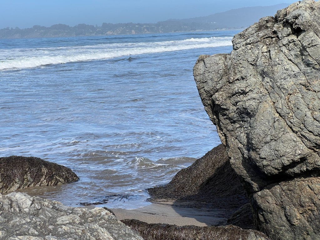 Last week I took my usual plethora of photos at Stinson Beach but one stayed with me. This morning, I shared the photo with my son and he pointed out that what I had interpreted as an unusual wave was a shark. He then sent me a diagram showing that, like an iceberg, 90% of the shark can be underwater and we may see only the fin.