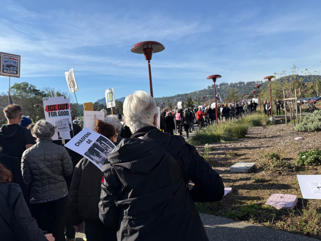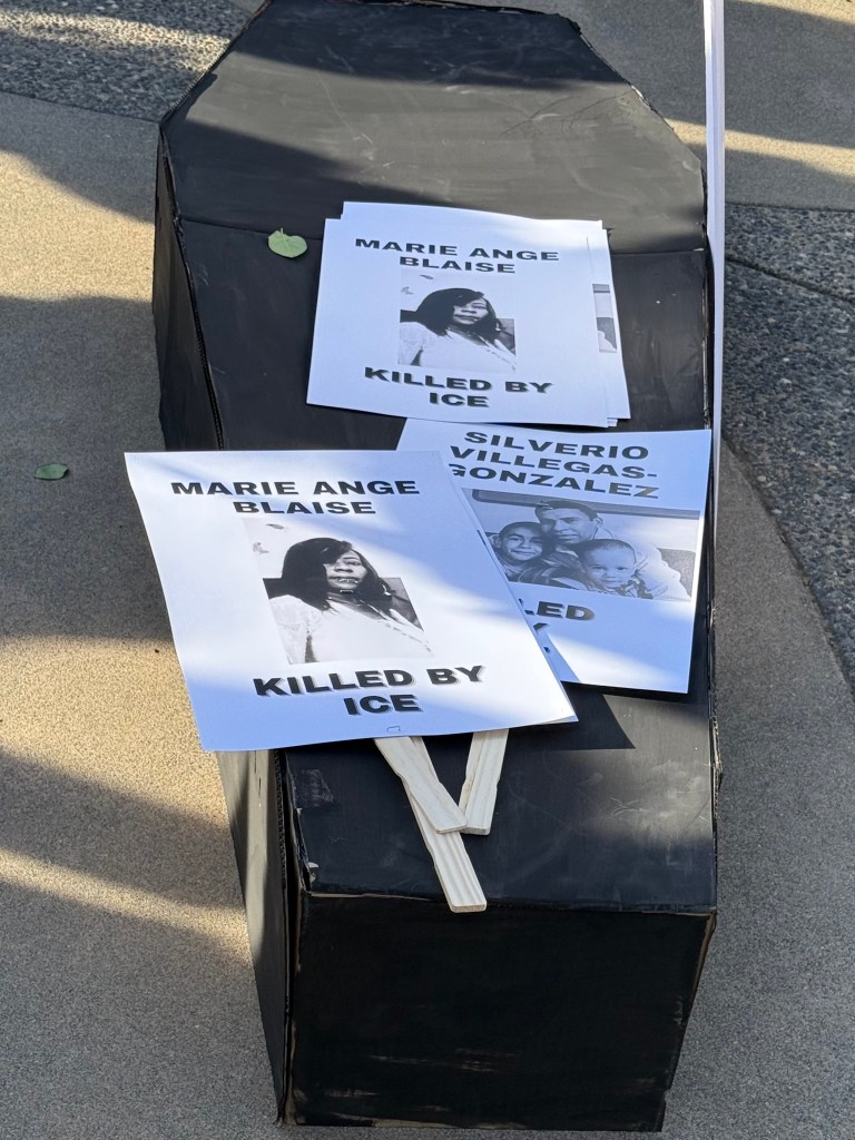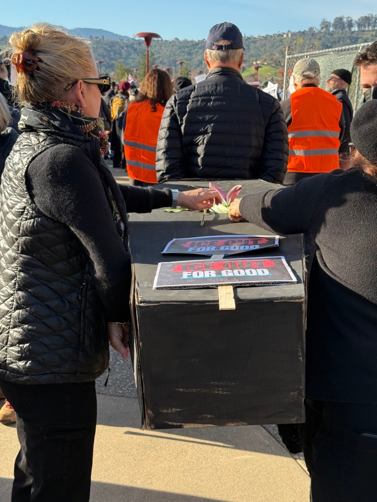 Yesterday I attended a protest/vigil in Marin County. We gathered at the Veteran’s Auditorium, and walked in a long and winding line around and through the Civic Center leaving flowers in front of the sheriff’s office and next to photos and names of the 33 people killed by ICE. Our sheriff’s office cooperates with ICE and we want ICE out of Marin. We were told to wear black, and bring a flower and did, so it was a sober line that stretched before and behind me. Six coffins had been made of cardboard and painted black and covered with flowers were carried along the route. It was a sober and quiet group. The event began with twelve minutes of speeches, most of that a prayer, so we began walking after saying Amen. Volunteers carried recorders repeating the names of the 33 people killed. Tears come enough now as I feel the immensity of the event, the power of people gathering to silently speak for empathy, morality, and Truth.