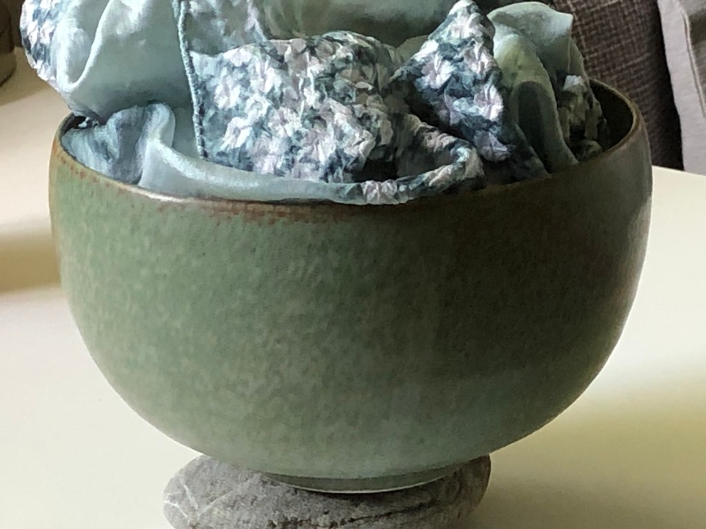 That morning I participated in a Sensory Awareness workshop on Zoom, each of us in our own homes where Michael Atkinson had asked us to gather and come with three objects, a scarf or bandana, a rock we could hold in our hand, and a bowl or vase.