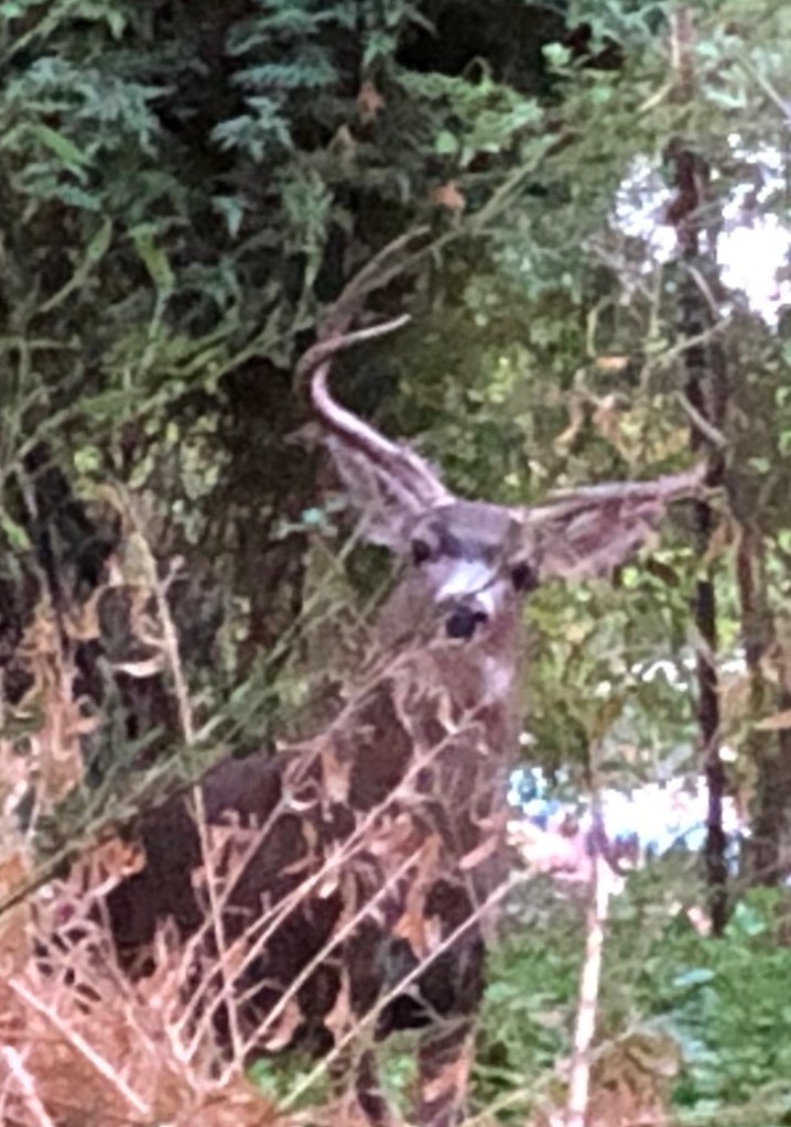 In the past, there were no obvious fences here, and the deer roamed freely and had their babies in our yards, but now new neighbors put up fences, so we’re fenced in, and I feared the deer might be fenced out. Therefore, I was delighted to see this buck jump right out of their newly landscaped yard. What a treat! Because we’ve been outside so much at night with the power outage, we’ve been hearing browsing down below our deck, and it was wonderful to see in full leap the reason why.