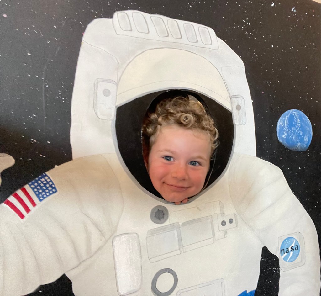 In the book, Little Bear puts on a hat of his own creation and goes to the moon. Since Grandson’s visit to the U.S.S. Hornet, he has decided he is an astronaut. His tent has become a rocket ship with a control panel created with the help of his parents.