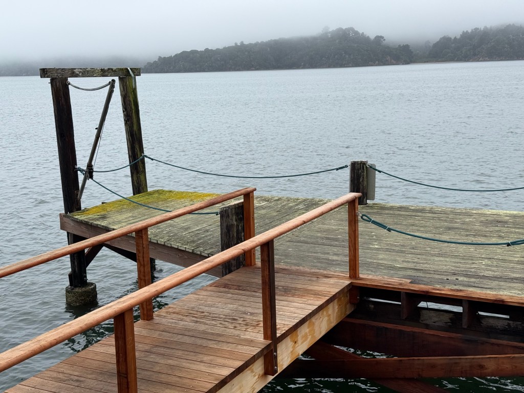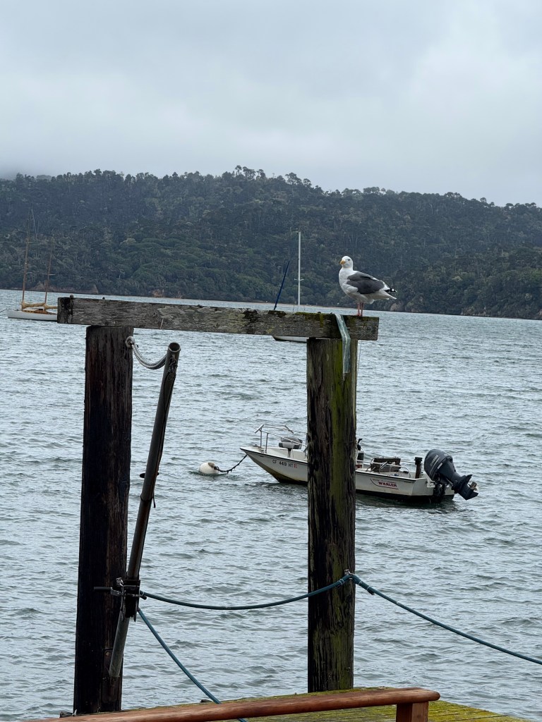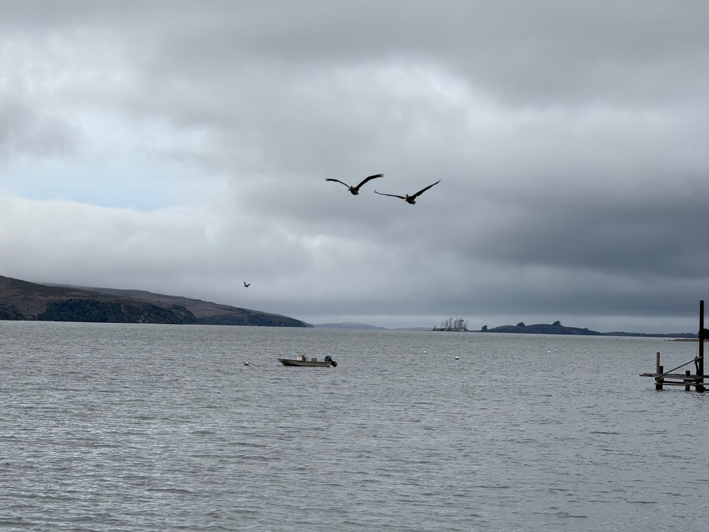 We’re in West Marin, in Marshall, on a house literally on Tomales Bay. I am bathed in the sound of lapping and waved in beautyas I sit on one continental plate and view another across the water.