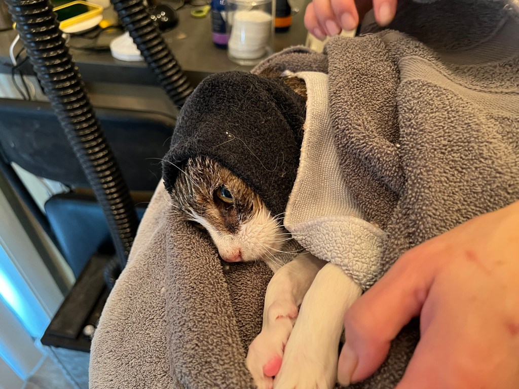 On our return, our cat needed to go to the Cat Spa. He’s older now and his fur mats in a way we can’t comb through so I sat and talked with a lovely woman as Tiger was outwardly pampered though he didn’t seem to recognize it, but then, he calmed and now he’s happy to be home and freshly groomed.