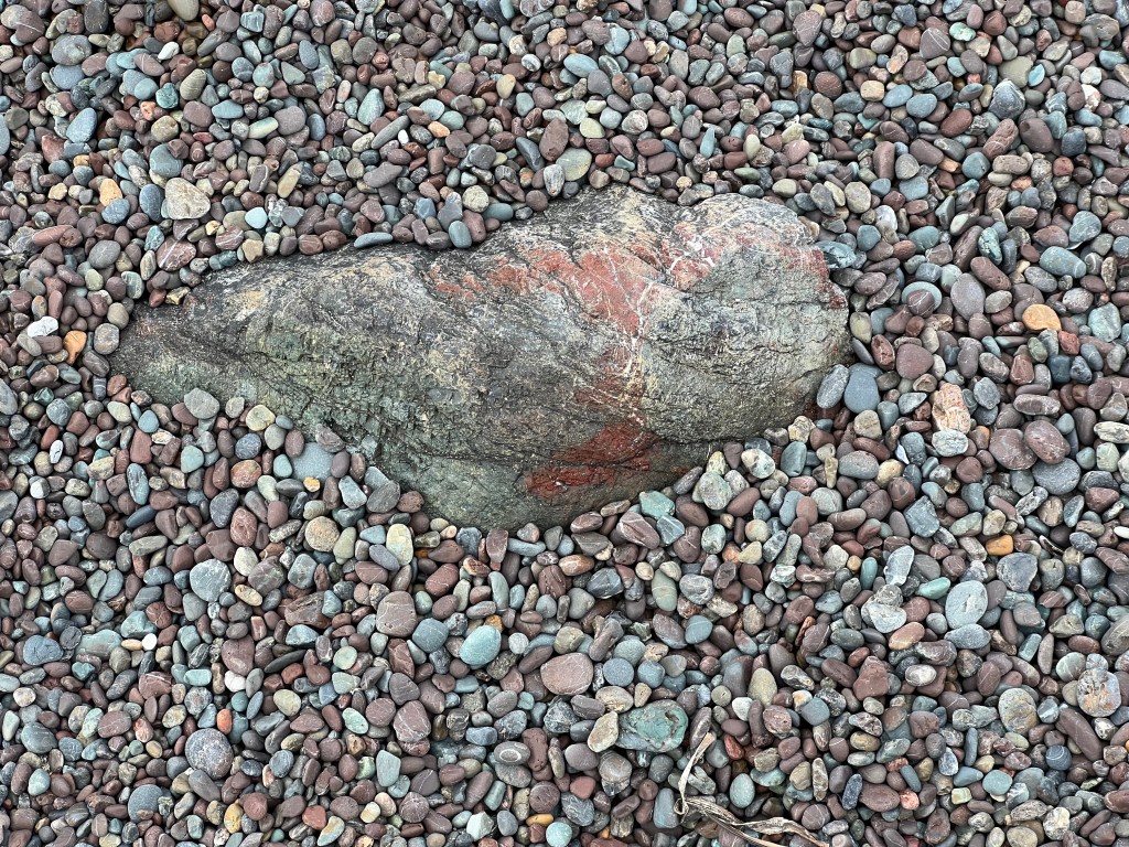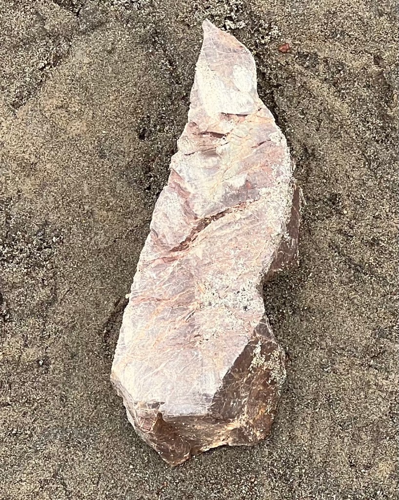 Walking on what I imagine it would be like to walk on the strength and challenge of a dragon’s tail.One rock left on the beach, held in bedrock below like a candle flame in wax.A face carved in stoneGatherings in size and shapeAn outcrop speaksHolding force