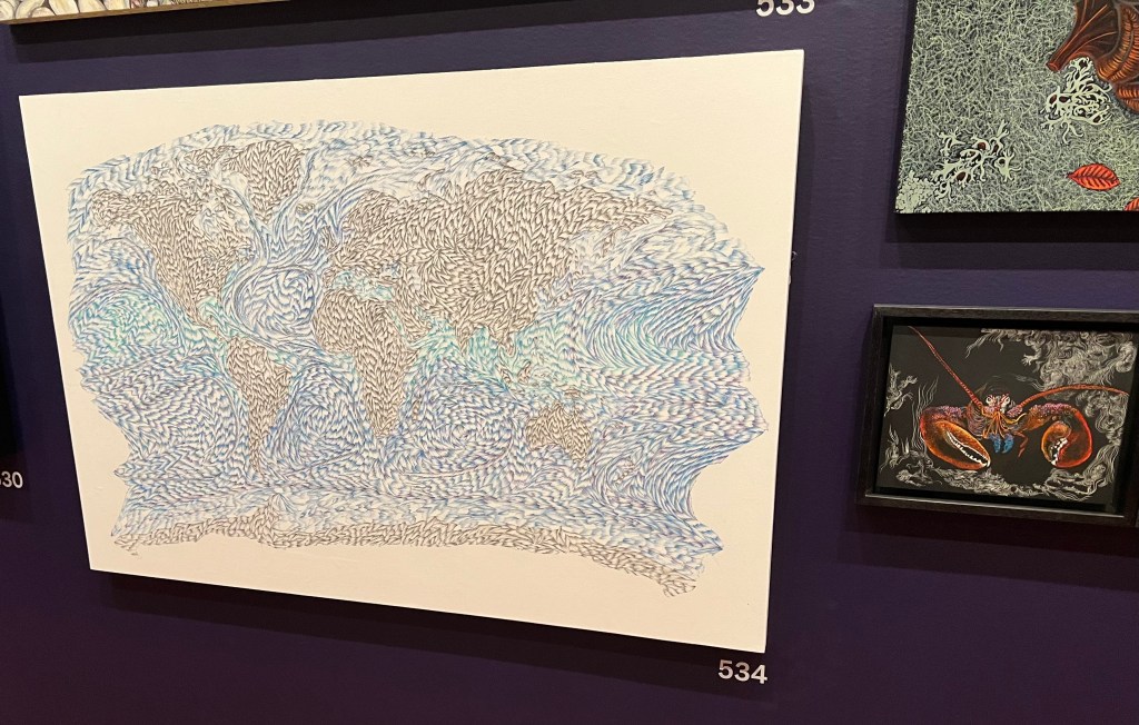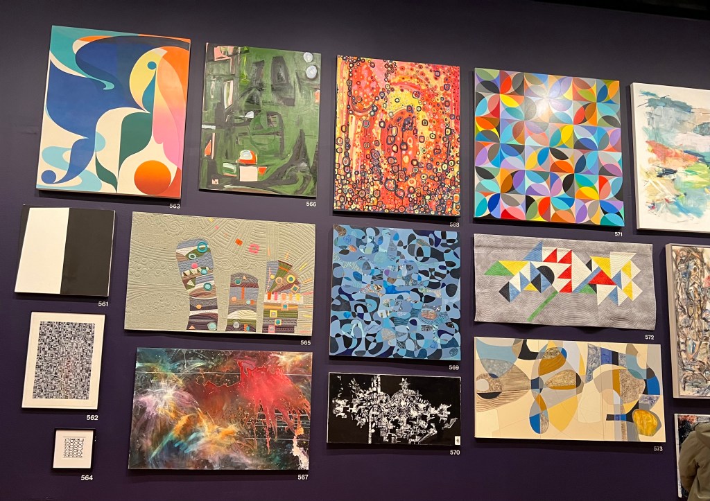 “The 883 artworks in this exhibition are installed nearly edge to edge, ensuring the greatest possible representation. The galleries include thematic groupings of art inspired by historical and contemporary political and social issues, the urban environment, the human figure, nature, abstraction, and surreal imagery.”