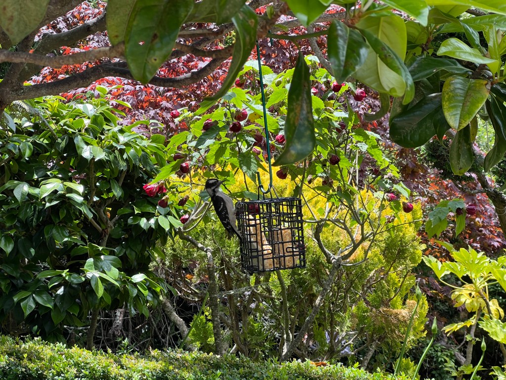 Woodpecker enjoying suet in the garden.Looking down into the summer creekHanging fruitBloomingSharingClusteringIntricacy of Hydrangea flowersScent and beauty of a Rose