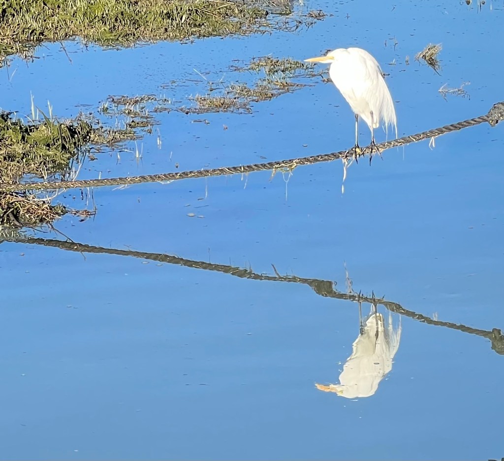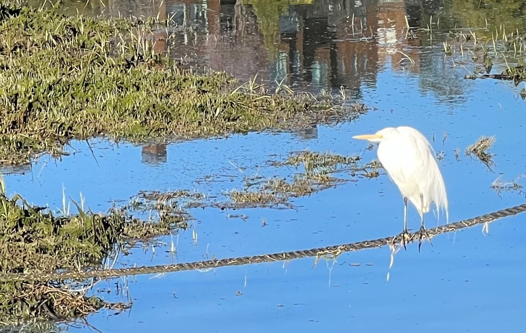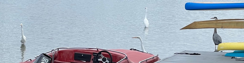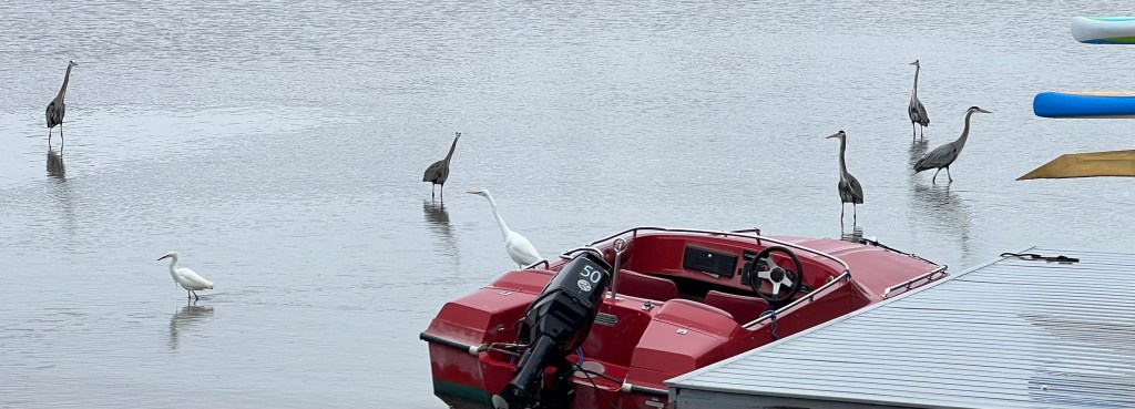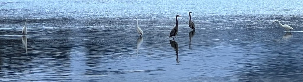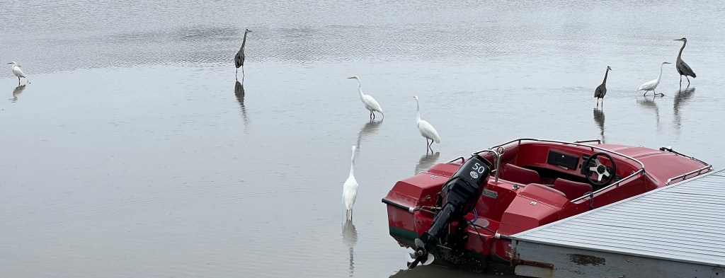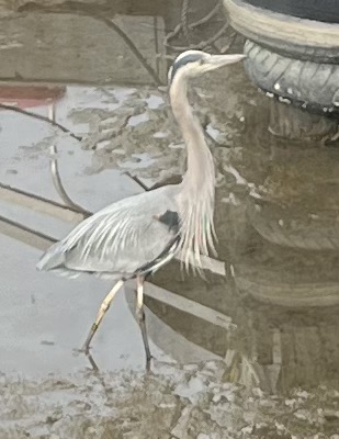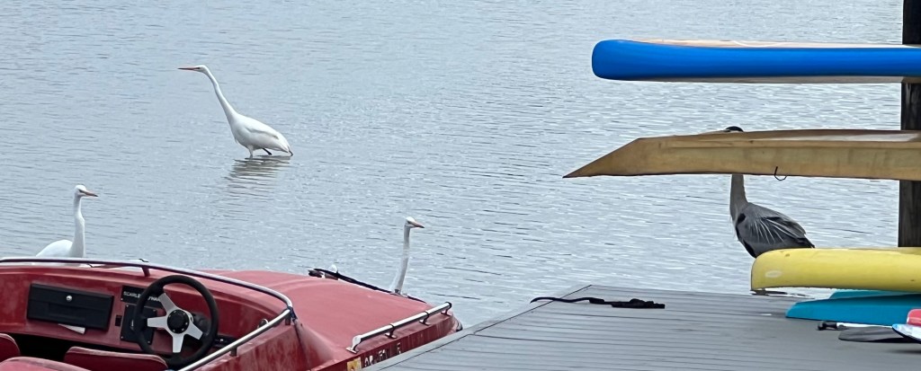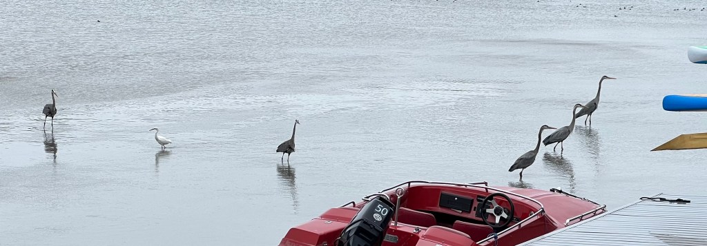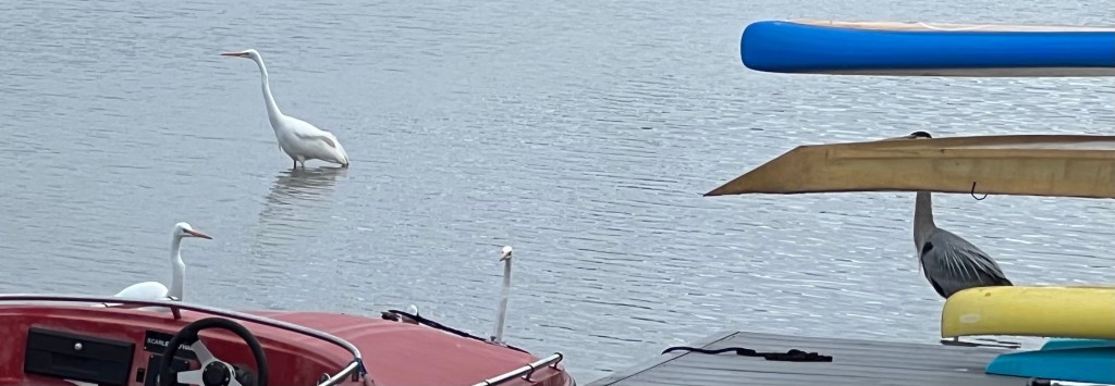 It’s low tide. An egret flies by the window. A Great Blue Heron lands right outside the window and then slowly strolls and explores around the boat.