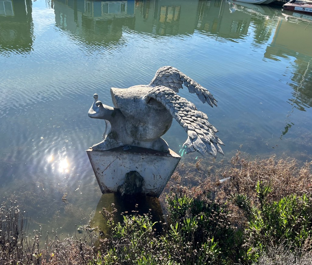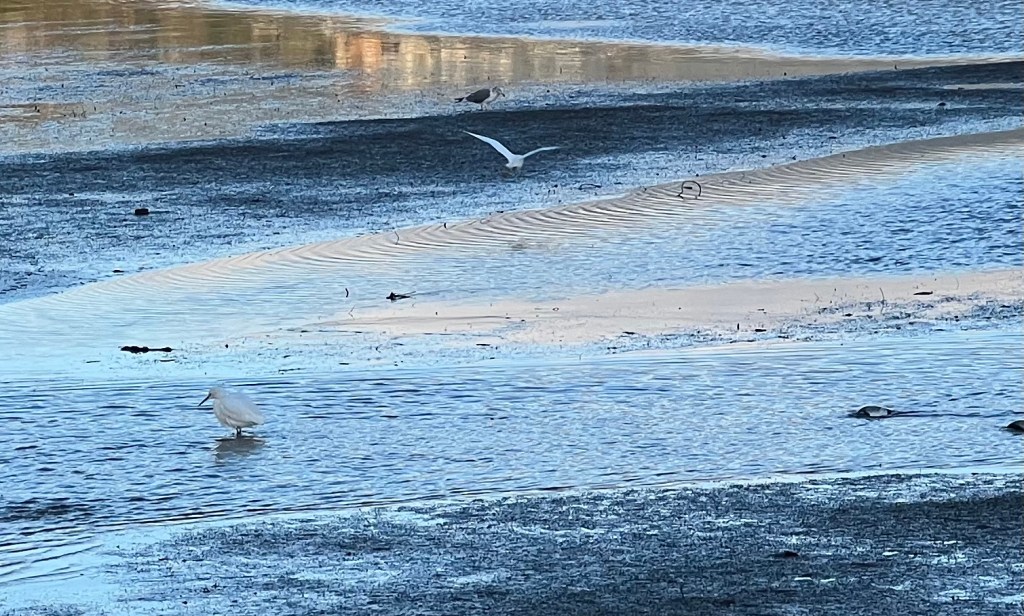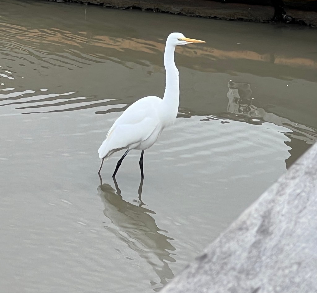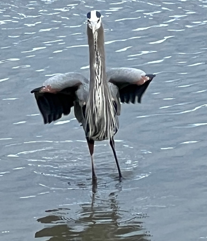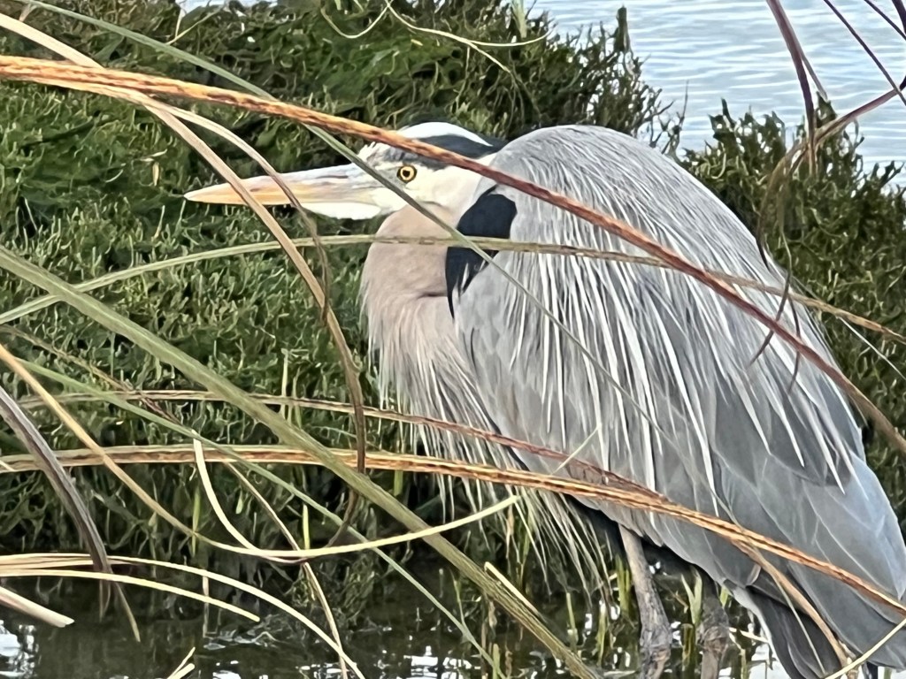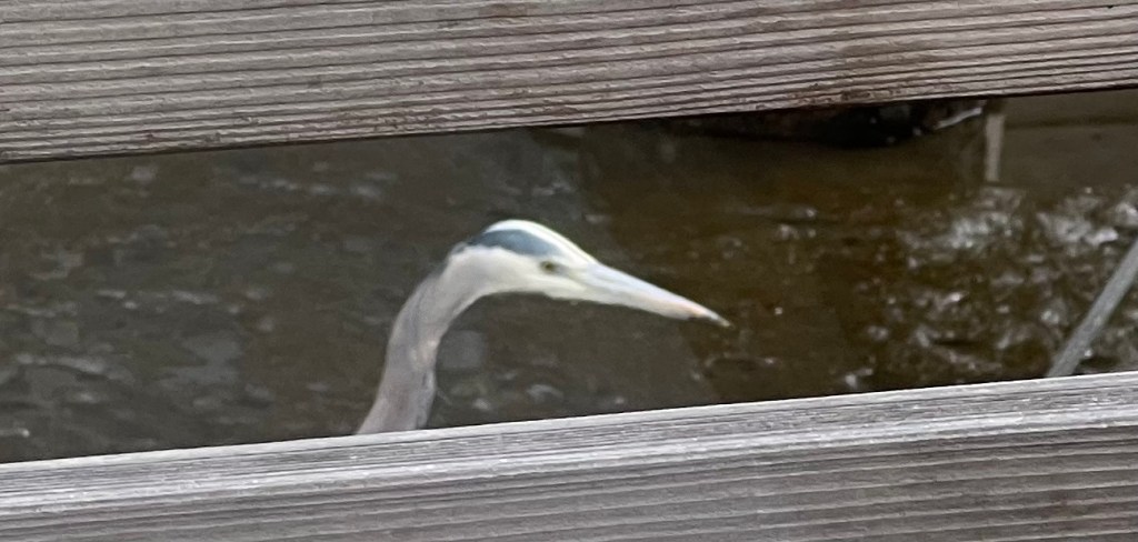 It’s low tide. An egret flies by the window. A Great Blue Heron lands right outside the window and then slowly strolls and explores around the boat.