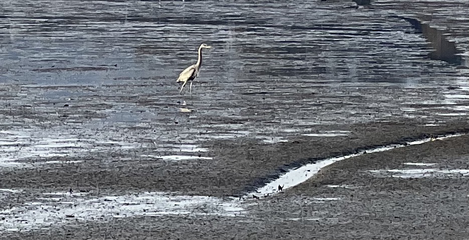 Great Blue Heron exploring the low tideAn egret flies by the heron The wonders of a mudflat, luxuriant with food And now GBH comes back the other way as water flows in