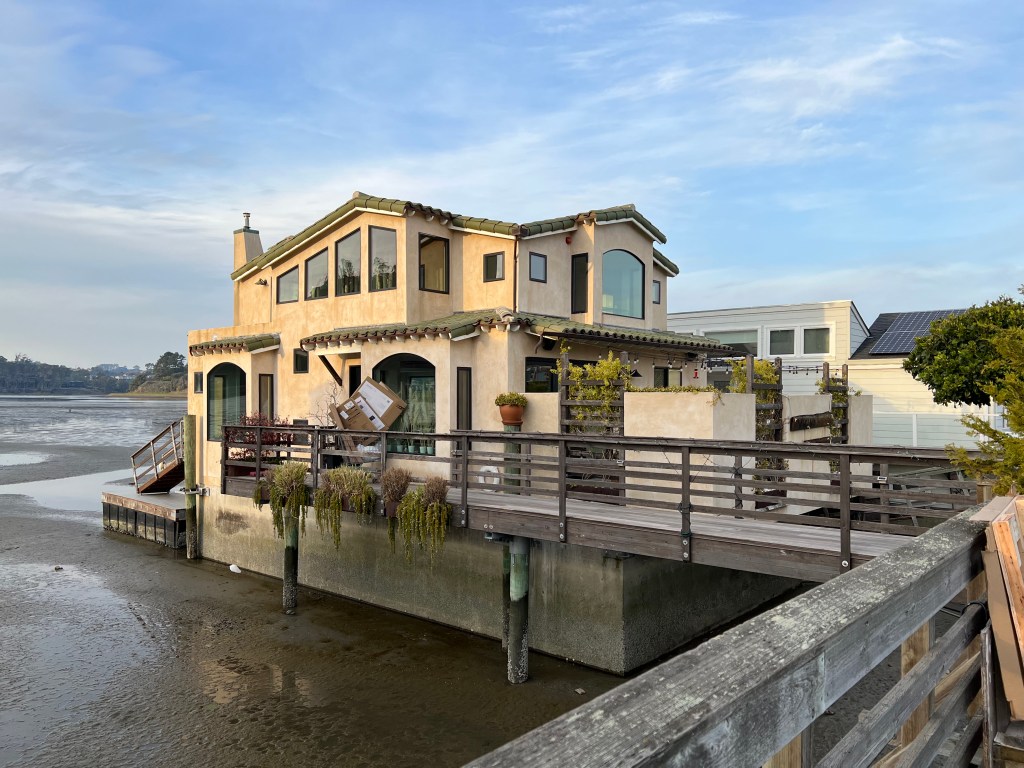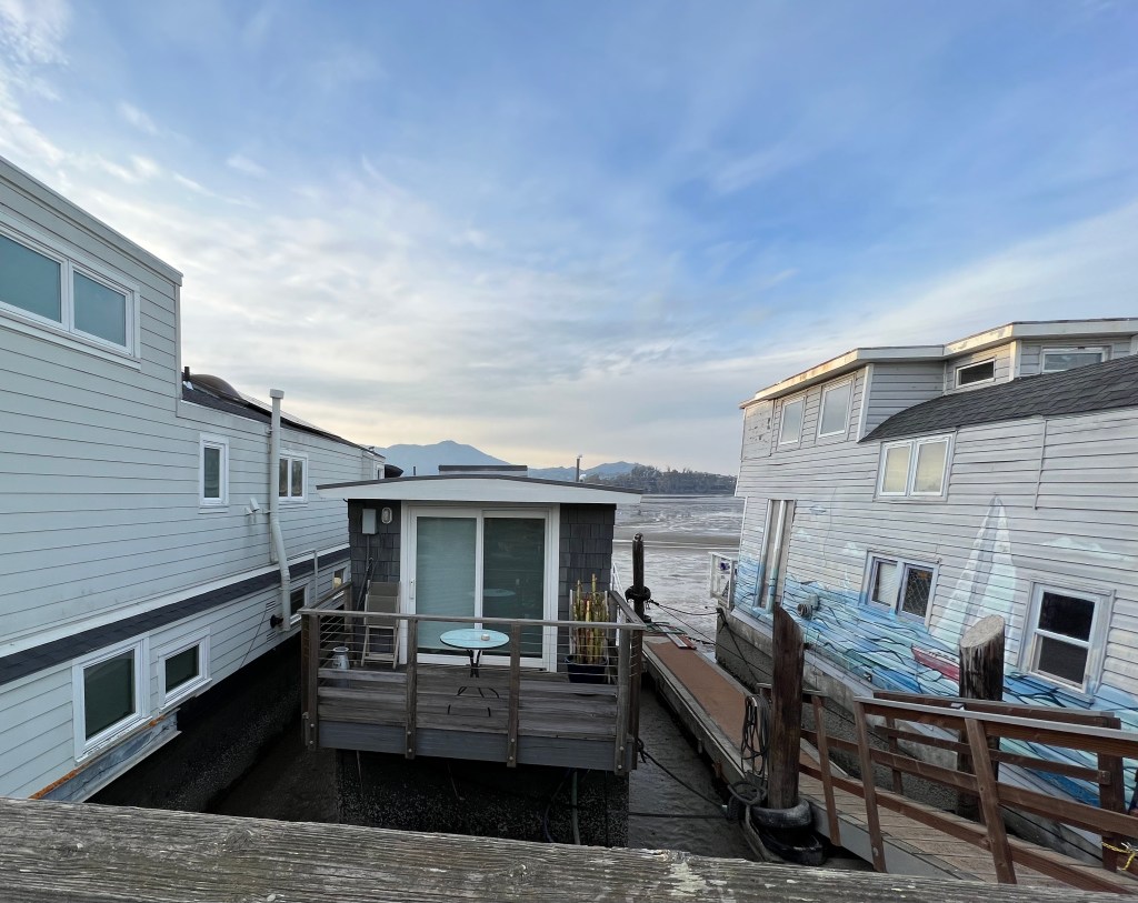 I’m in/on a houseboat, a little one, dwarfed perhaps by the big guys, but as the owner says that means I’m right by the water, literally. It’s lapping at the deck. It’s mesmerizing. I wish I could capture the movement, and the changes from low tide last night to high this morning. Such a gift!
