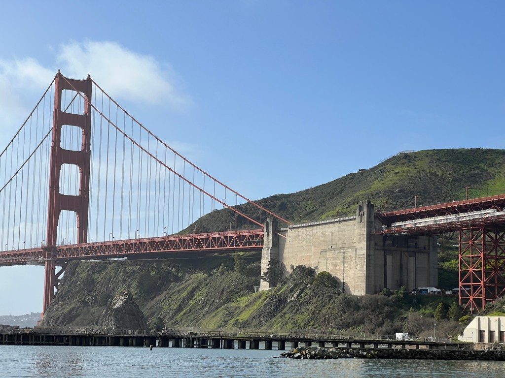 At Cavallo Point yesterday outside the Bay Area Discovery MuseumView of the city Sunday morning from Cavallo PointI hear a cheep and look down to see a little bird serenading the day – Cavallo PointDucks come to the dock to check me out – then float gently away when I appear to take a picture.And there’s home with the acacia in bloom and the ridge turning green from all the rain.