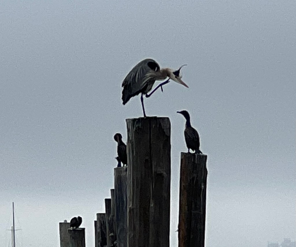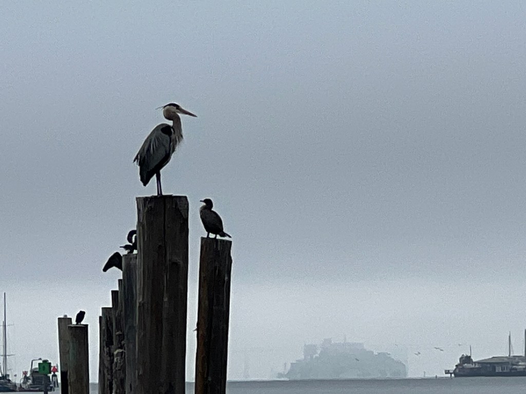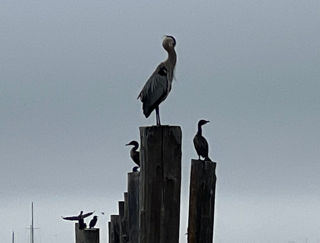 Great Blue Heron and Cormorants in Sausalito – Alcatraz in the backgroundGreat Blue Heron Grooming on the top postA neck scratch to finish the grooming sessionThe swirling tideReflecting stillness