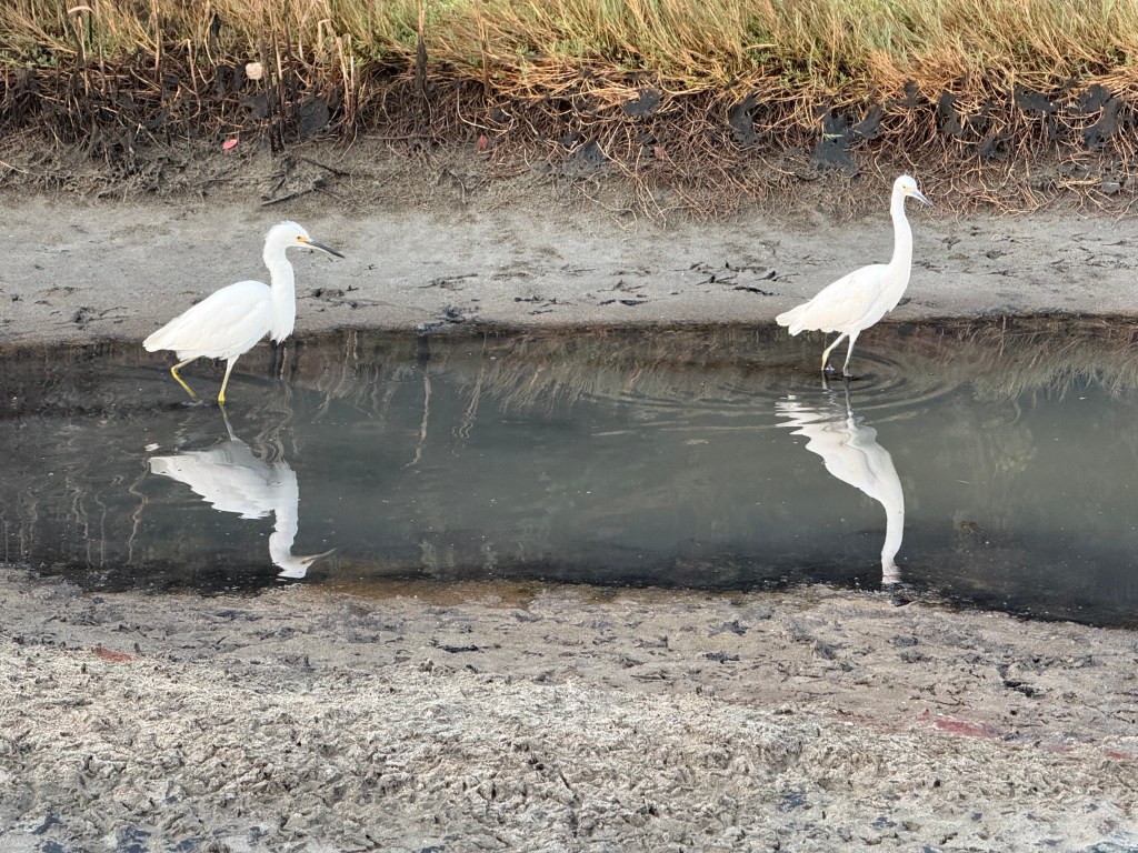 Mirrors along the pathMorning sky along the bayEgrets PlayAnd there is one!Here comes the Sun!Begin the day in Gold!