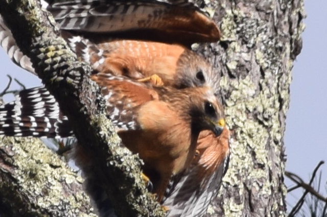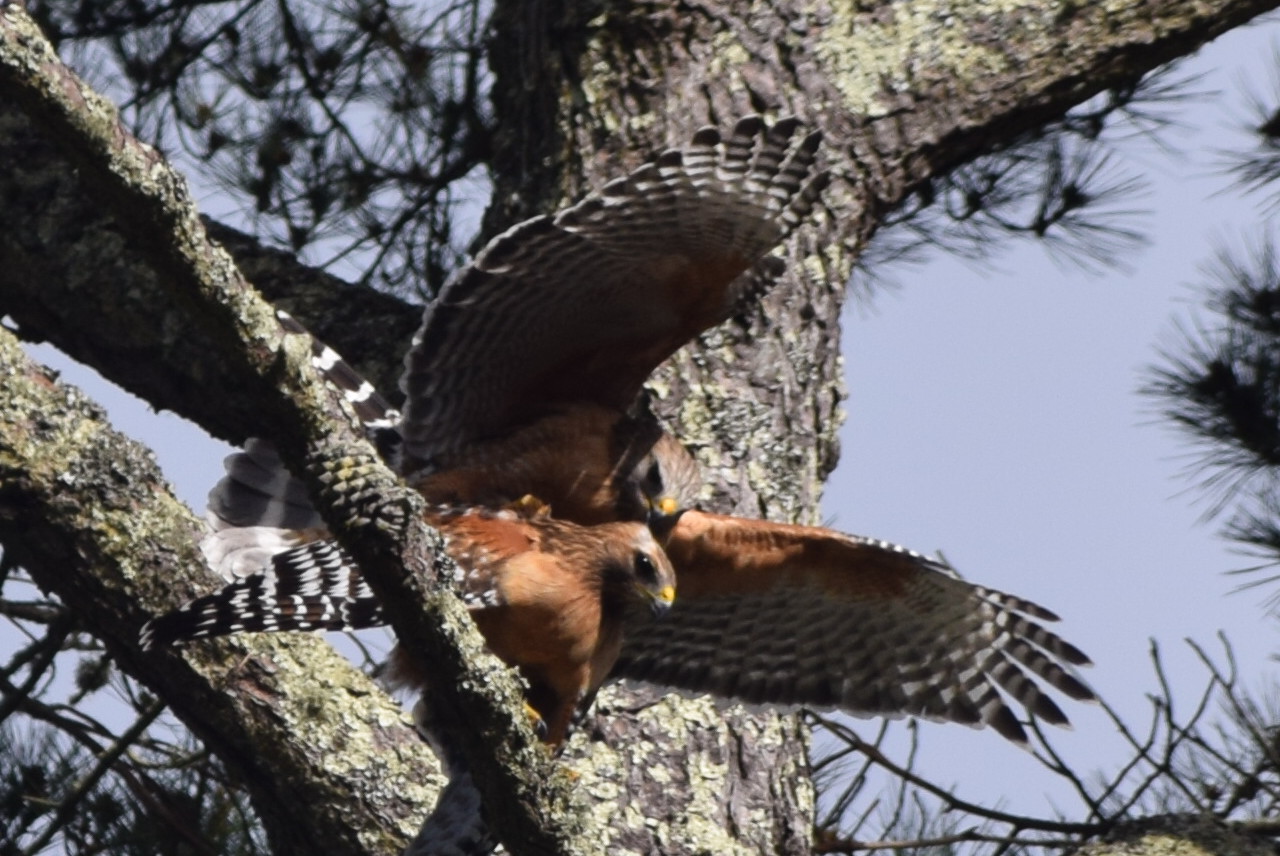 My neighbor Jeanine Aguerre opened her eyes, ears, and sensitivity this morning when she walked out her door and heard shrieks coming from a pine tree. Interpreting the sounds as a love song, she grabbed her camera and took these photos of two hawks.