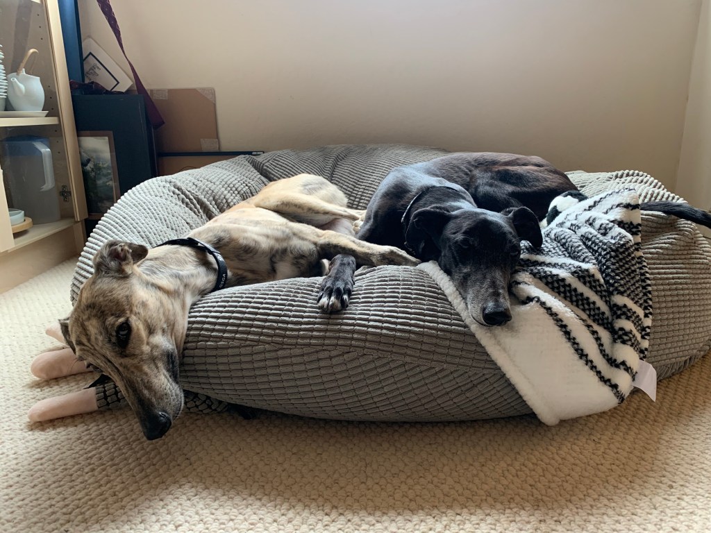 Ebi and Ginger have come to my son and his wife from a racetrack in Florida. They are rescue greyhounds,, rescued through the love, work, and care of volunteers. They’ve lived in separate crates, and now, though there are beds throughout the house, they share a bed, a home, and intertwined legs, and it’s only been a few weeks.