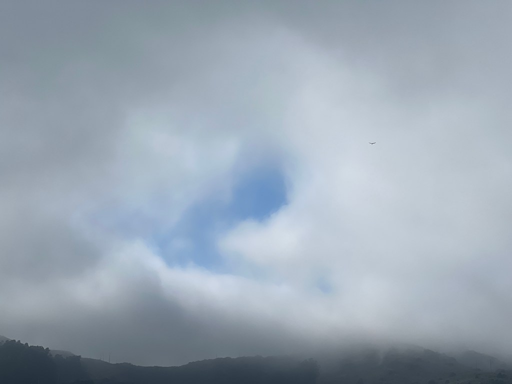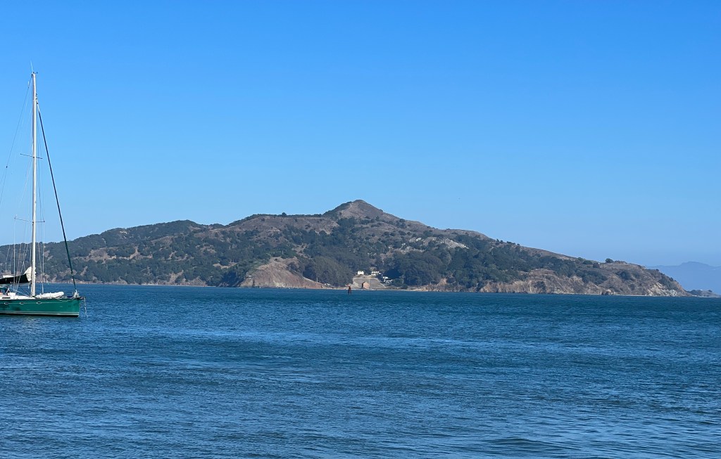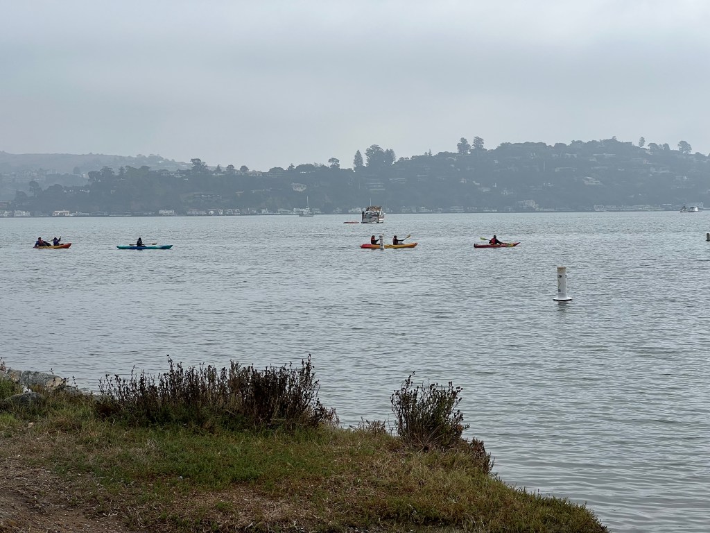 Angel Island on Monday afternoonLooking south to San Francisco The next day looking across to the east seems so close as kayakers paddle by ReflectingClouds open to the blue of sky and a bird flies by