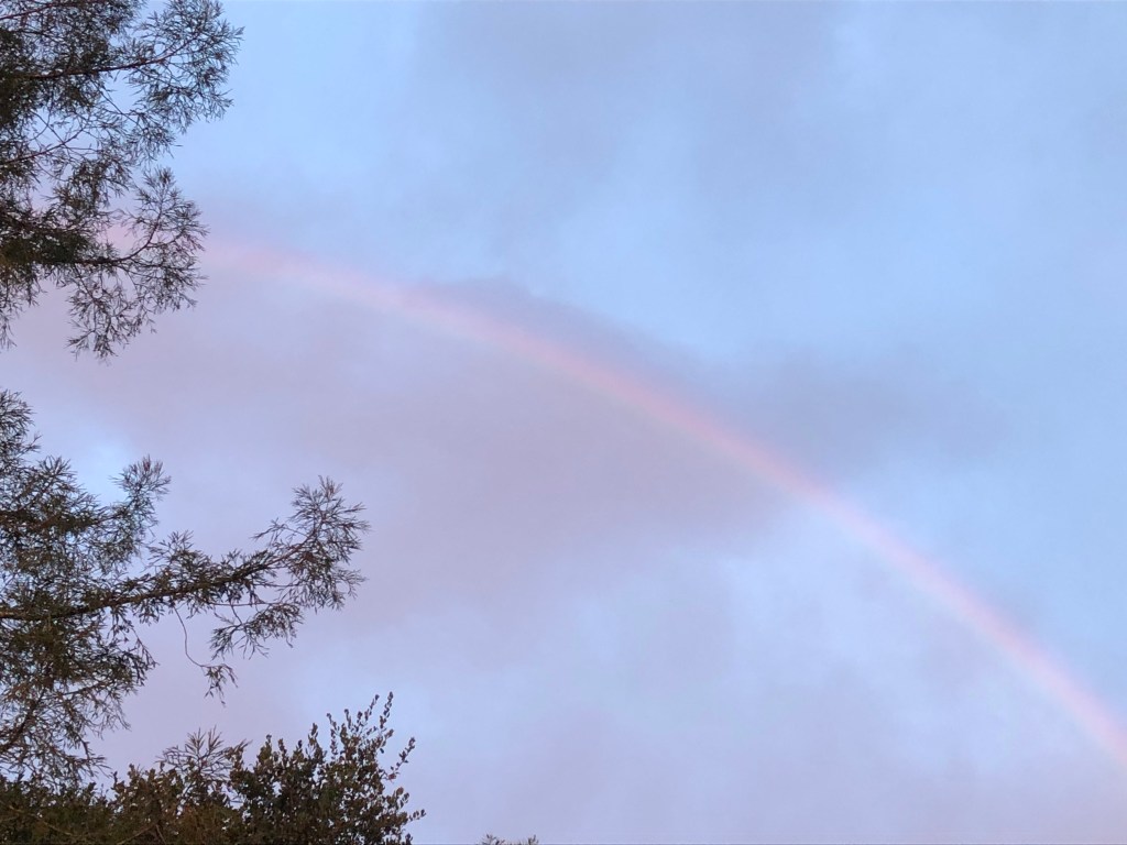 This morning I rise early and as the day comes to light, there’s pink in the sky. Outside, taking pictures, drops of rain fall, and as I turn, a rainbow in the sky.