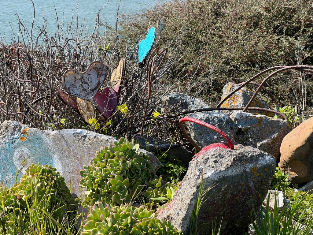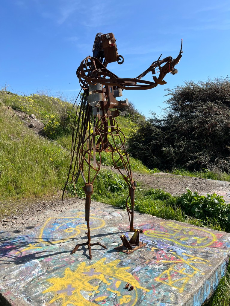 Sculpture at the Albany Bulb, formerly a construction debris landfill.The four directions honored at the Albany BulbA tree stump transformed into a place to rest with support!